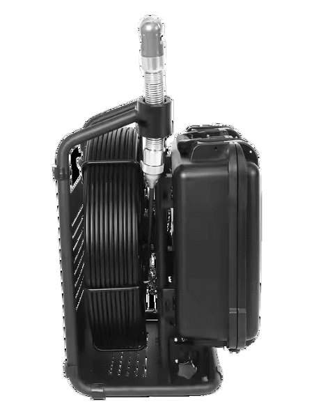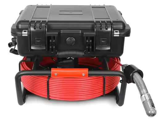 Câmera de rotação 360° (pan-tilt) de 33 mm, equipada com cabo de fibra de vidro vermelha de 7 mm, disponível nas opções de 30 ou 50 metros.